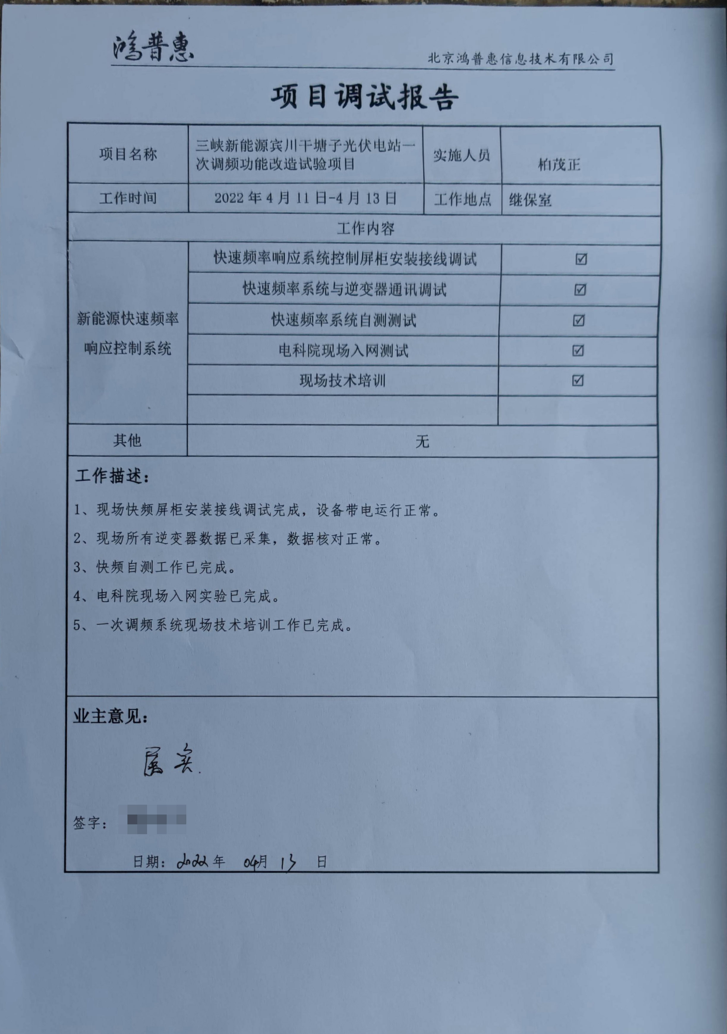 4月13日,三峽新能源賓川干塘子光伏電站一次調(diào)頻改造項(xiàng)目通過云南電科院入網(wǎng)測試。