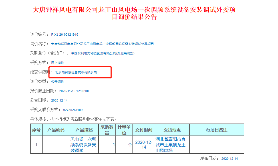 熱烈祝賀鴻普惠中標(biāo)“大唐鐘祥風(fēng)電有限公司龍王山風(fēng)電場一次調(diào)頻系統(tǒng)設(shè)備安裝調(diào)試外委項(xiàng)目”