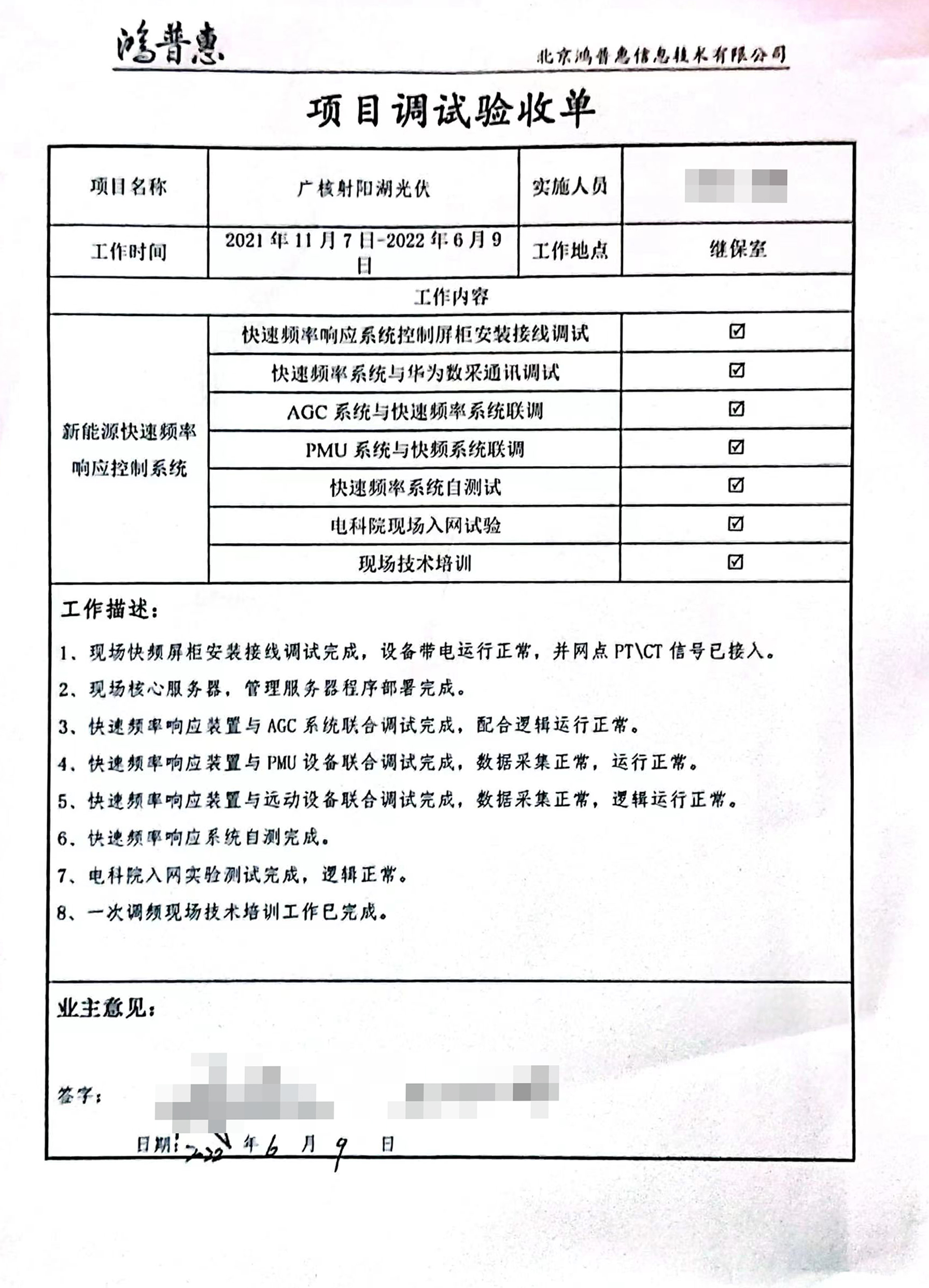 2022年6月9日鴻普惠承接的中廣核江蘇射陽湖光伏電站一次調(diào)頻改造順利通過入網(wǎng)檢測!