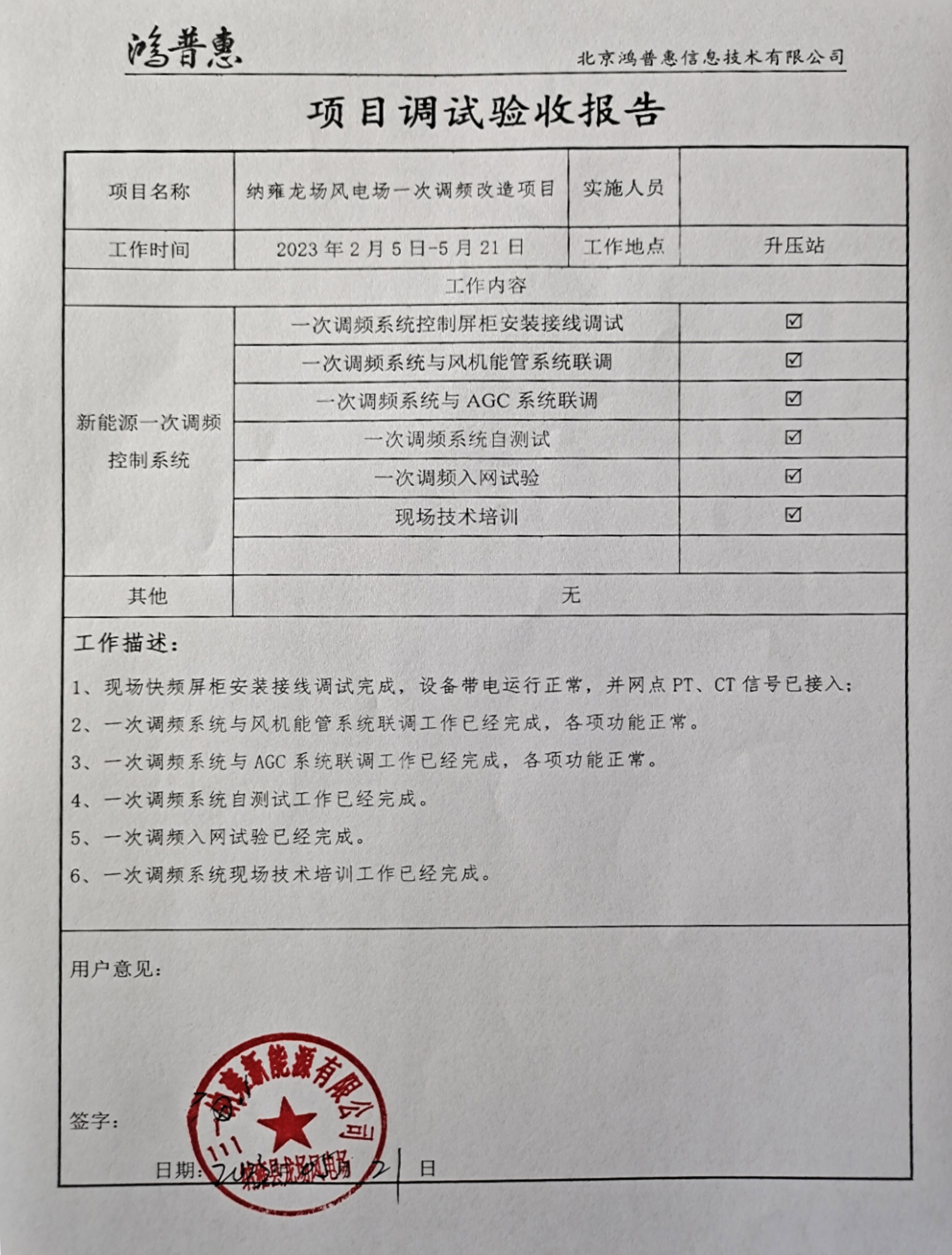 2023年5月21日鴻普惠承接的國電投納雍龍場風(fēng)電場一次調(diào)頻改造試驗(yàn)項(xiàng)目順利通過入網(wǎng)檢測!